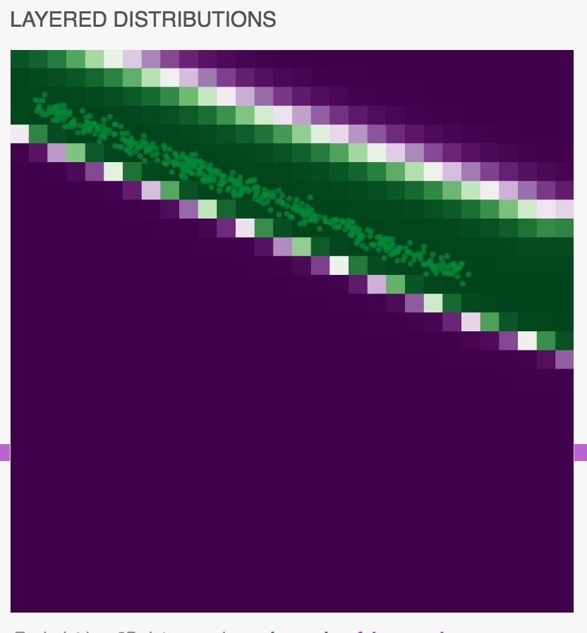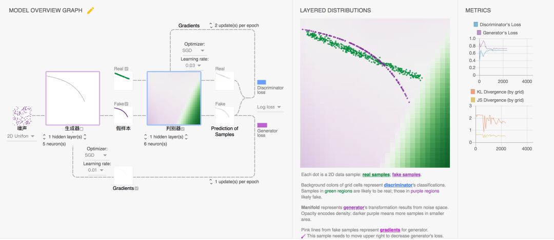 左侧的网络区, 包含了这个 GAN 的网络结构,和生成过程。中间的展示区,展示了,生成器生成的假样本(图中紫色),在不断拟合真样本(图中绿色)的过程, 同时,展示区,还通过背景颜色的不同,展示了判别器,对各个样本的判别结果:紫色背景,表示判别为假; 绿色背景表示判别为真。