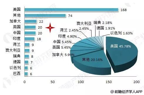截至2017年6月,全球人工智能初创企业共计2617家。全球共有367所具有人工智能研究方向的高校。而由代表性国家人工智能企业数和高校情况数来看,美国发挥了一贯的领军作风。截止至2017年6月美国共有1078家人工智能相关企业,排名首位;我国以592家排名第二。就高校的情况看,美国共有168个学校已经开设了针对人工智能的相关研究,占开课方向总数的45.78%;加拿大、中国、印度、英国位于第二梯队,我国仅为20家,远远低于美国相关人才的供给能力。