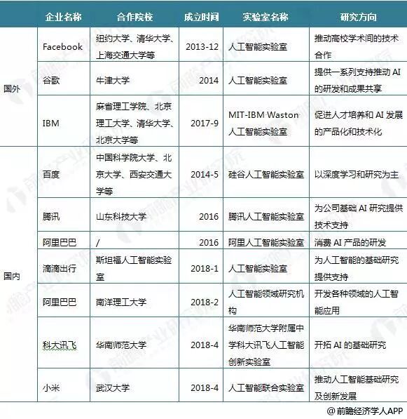早在2013年Facebook已与纽约大学、清华大学、上海交通大学等高校合作,共同设立人工智能实验室,以企业的实际需求为引导,推动高校学术间的技术合作。随后谷歌和IBM等国外优势技术企业纷纷设立人工智能实验室,为人工智能的发展培养了大量的优质人才。