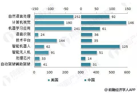 图表4:截至2017年6月中美人工智能各产业企业数统计(单位:家)