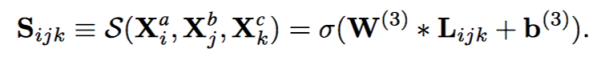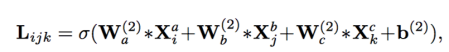 于一阶相似性,本文采用的是multilayer perceptron,分成两个部分。第一部分是模型框架中的第二层,这是个全连接层而且激活函数是非线性的。输入是三个节点(vi,vj,vk)(他们属于三个不同的节点类型a,b,c)的向量表示(Xai,Xbj,Xck)。作者把他们拼接起来,并且映射到统一的空间L。