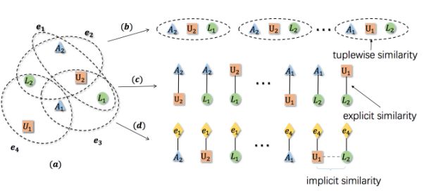 提出的方法将超网络建模为一个整体,同时,元组相似性得到了保护。在群体扩展中,每个超边被扩展为一个群体,每个节点对被显示的标识为相似。在标注扩展中,超边中的每个节点均连接与一个代表原始超边的节点上。原始超边中的每个节点均连接到一个相同的节点上,形成隐式相似。