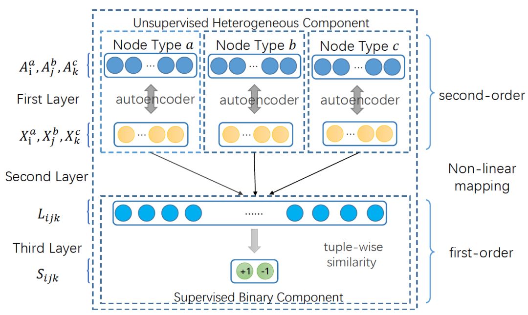 前面讲到在异质网络中要解决两个问题:不可分解性和结构保留。对于不可分解性,作者设计了不可分解的tuplewise相似性函数。这个相似性函数定义在hyper edge的所有节点上,确保超边的子集并没有融合在网络表示中,并且这个函数是非线性的。为了保留网络结构,作者设计了一个 Autoencoder,通过重构节点的邻居结构来学习节点表示,也就说有相似邻居的节点将有相似的向量表示,每一种节点类型对应一个autoencoder。这两部分在模型中,联合优化来同时解决这两个问题。模型框架图如下: