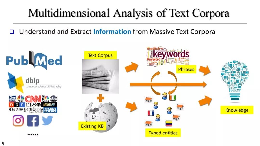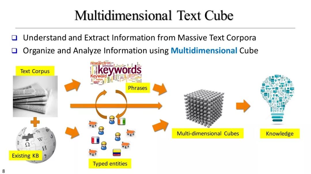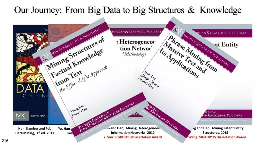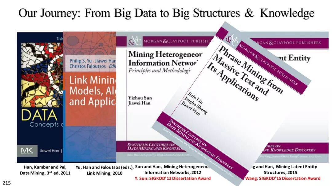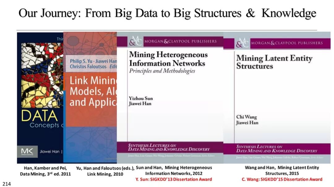 在今天的信息社会中,我们被大量的文本数据包围,从新闻文章和社交媒体,到研究文献、医疗记录和公司报告。数据挖掘研究者面临大一大挑战是,如何设计有效并且具有可扩展特性的方法来挖掘此类庞大的非结构化文本语料库,以发现隐式结构并生成多维的文本异构信息网络,从中可以根据用户的需求生成可操作的知识。