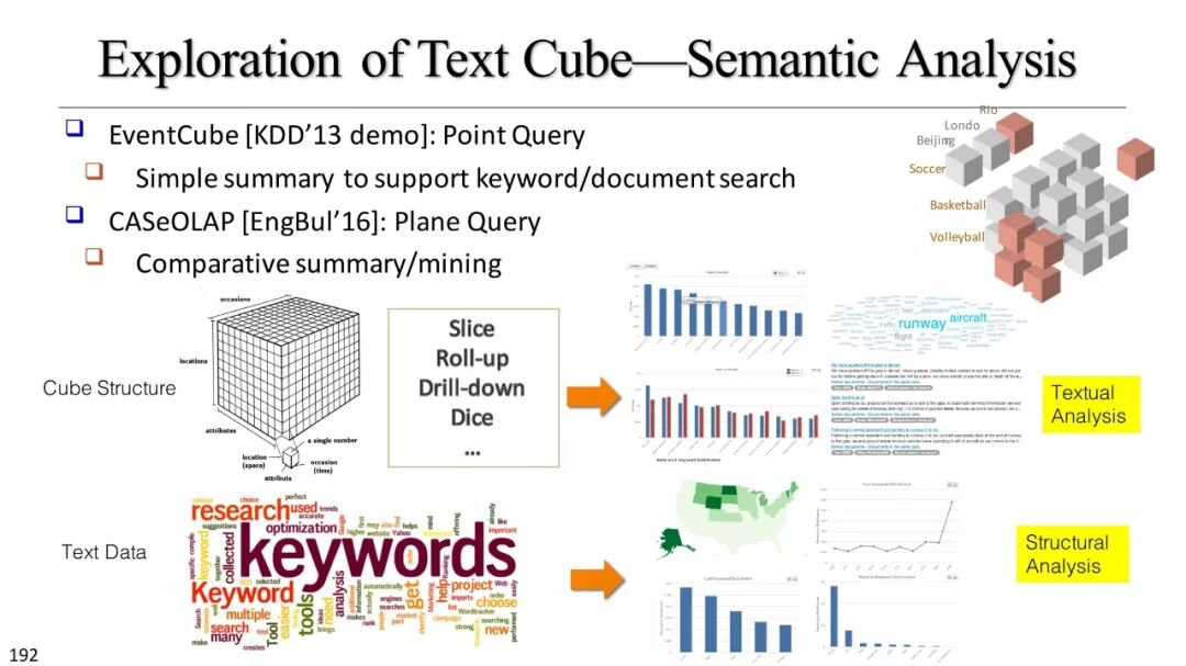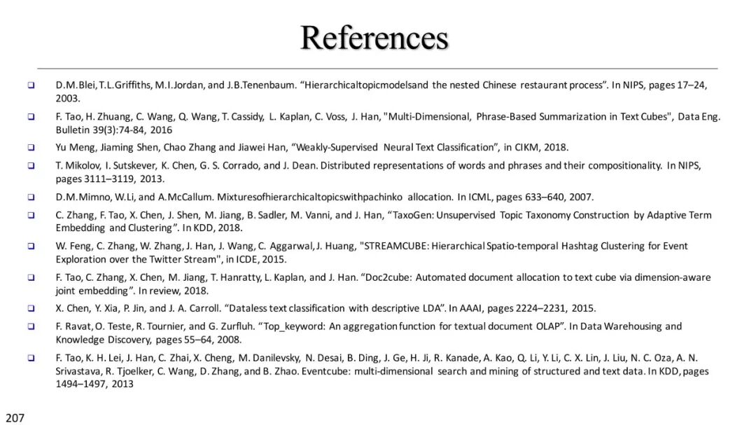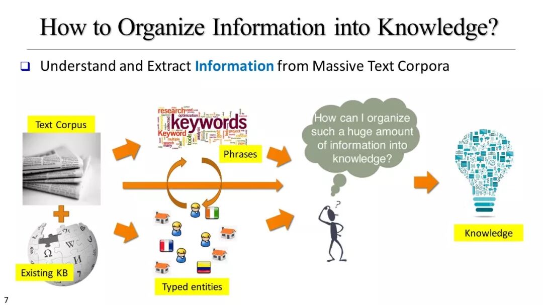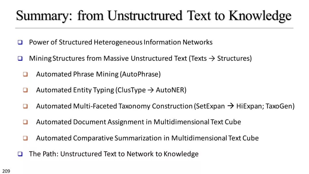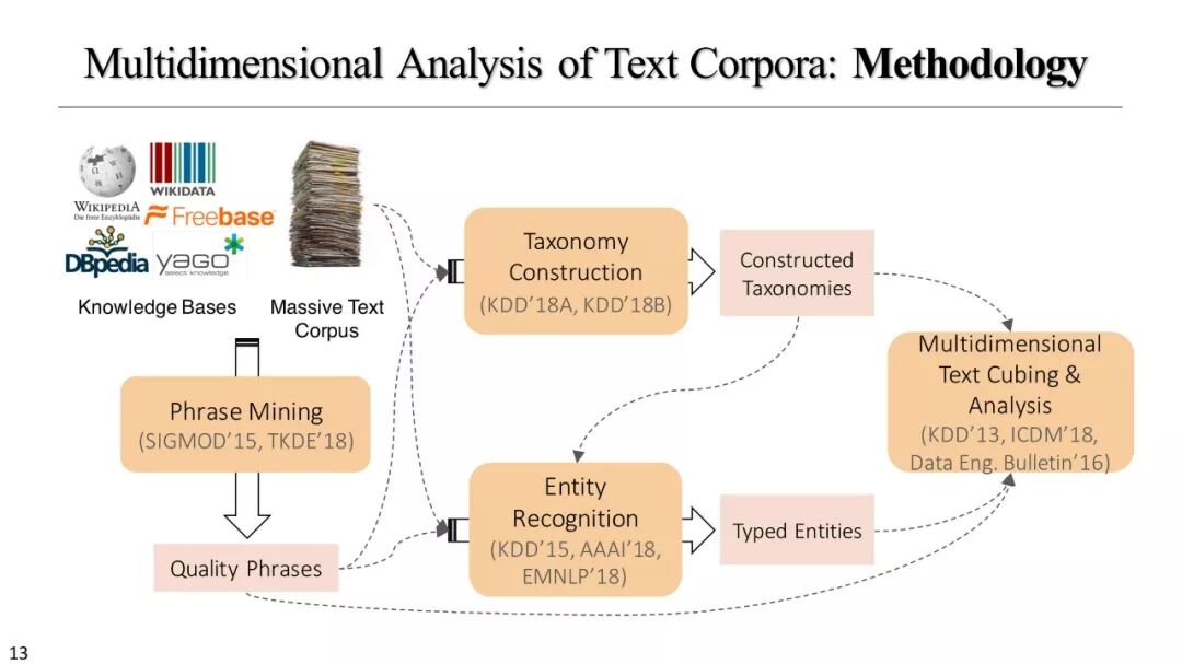 在今天的信息社会中,我们被大量的文本数据包围,从新闻文章和社交媒体,到研究文献、医疗记录和公司报告。数据挖掘研究者面临大一大挑战是,如何设计有效并且具有可扩展特性的方法来挖掘此类庞大的非结构化文本语料库,以发现隐式结构并生成多维的文本异构信息网络,从中可以根据用户的需求生成可操作的知识。