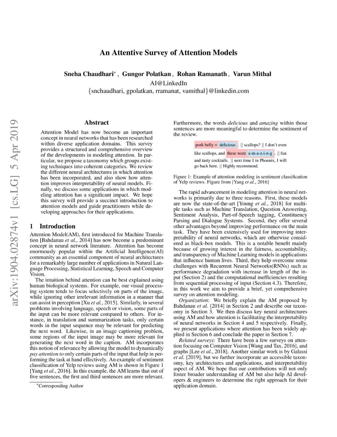 本篇综述提供了关于注意力模型的全面概述,并且提供了一种将现有注意力模型进行有效分类的分类法,我们调查了用于不同网络结构的注意力模型,并显示了注意力机制如何提高模型的可解释性,最后,我们讨论了一些受到注意力模型较大影响的应用问题。我们希望本次综述能够为为大家提供一份简明扼要的介绍,帮助大家理解这一模型并着手进行实践。