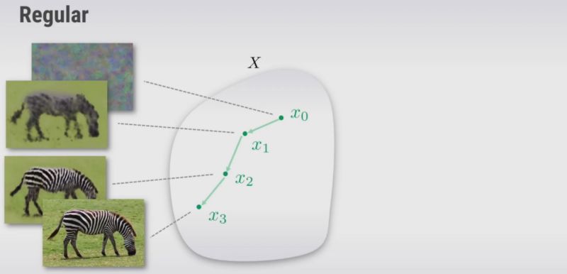 现在的任务是最小化图像x上的Eq(2)。 传统方法是用随机噪声初始化x,然后计算函数相对于x的梯度并遍历图像空间直到我们收敛到某个点。