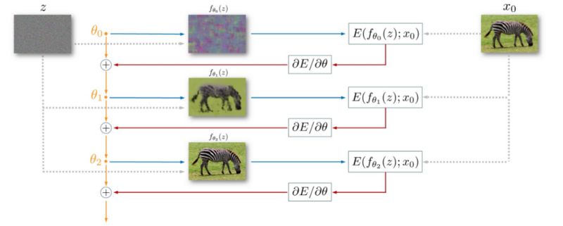 其中,z是随机固定输入图像,θ是随机初始化的权重,将使用梯度下降更新以获得所需的输出图像。