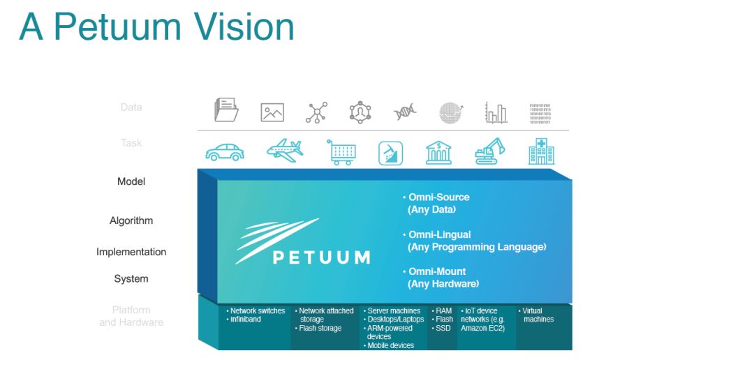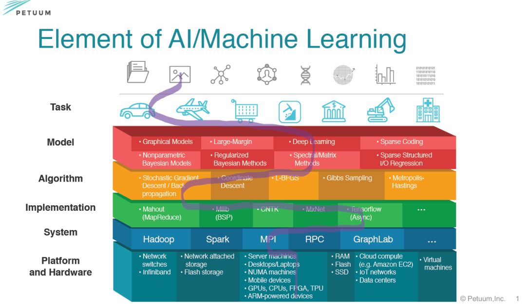 这一份286页的教程slides从统计机器学习视角阐述了深度学习的算法、理论和分布式深度学习架构,内容丰富详实。首先一观邢波教授创立的Petuum人工智能/机器学习架构图,分别包含平台硬件层、系统层、实现层、算法层、模型层和任务应用层。