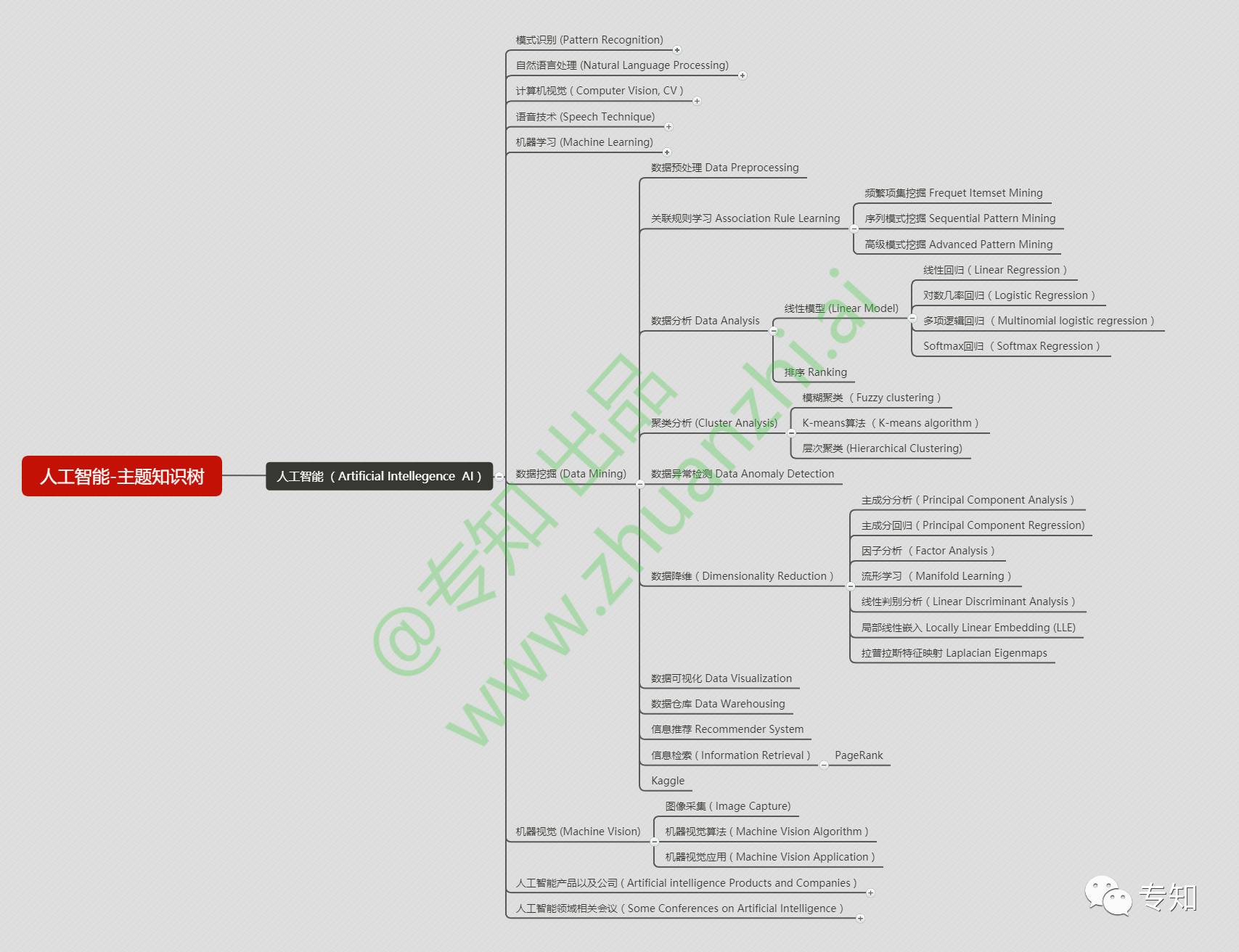 机器学昨天,我们介绍了专知的核心结构-《主题知识树》。 我们基于网络采集聚合抽取、众包机制贡献、先验知识融合的三种知识来源方式进行融合并专家审核构建完成人工智能主题知识树。主体以以人工智能、大数据、编程语言、系统架构四大类目来建设。今天我们展示人工智能的主题知识树可视化。