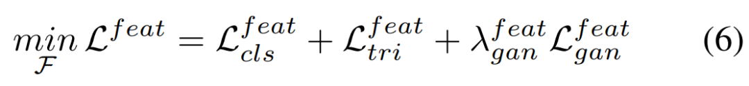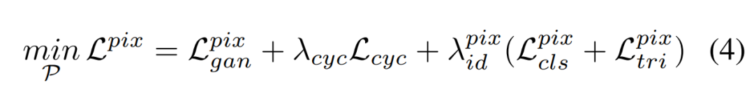 具体来说,我们的像素对齐模块包含一个循环损失(cycle loss)以及一个ID损失(cls+tri)。其中,循环损失使得生成的图片能够保持原有的结构和内容(比如姿态、角度等),ID损失使得合成的图片尽可能和原始图片保持相同的身份信息。这些损失函数分别如公式1,公式2所示。