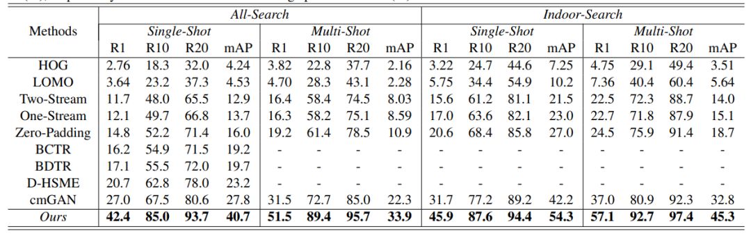 SYSU-MM01是由中山大学吴岸聪等人采集的彩色-红外行人重识别数据集。它包含来自4个彩色摄像机和2个红外摄像机采集的491个人的超过3万张图片。是目前本领域最大,最具挑战性的数据集。在该数据集上,我们的方法显著的超过了其他的方法是少10%。