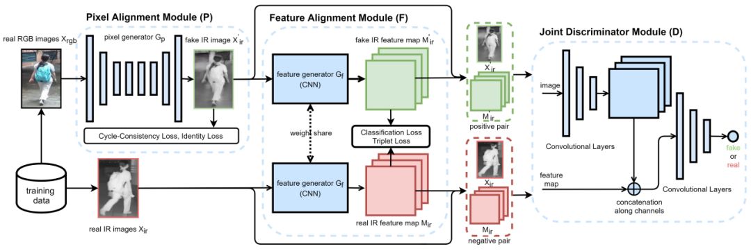 联合判别模块:考虑身份一致性,保证模态对齐不会引入新噪声。尽管如此,我们仍然面临一个棘手的困难,那就是行人重识别是一个Zero-Shot问题,即测试标签和训练标签是不重合的。因此,在训练过程中,像素对齐和特征对齐模块均无法通过简单的拟合训练集合的标签,来确保推理过程的身份一致性。比如,在特征空间,行人A的彩色数据可能会被对齐到行人B红外数据。这种情况下,虽然模态差异减少了,但是身份信息却丢失了,最终无法进行正确的行人重识别,这是我们不想要的。