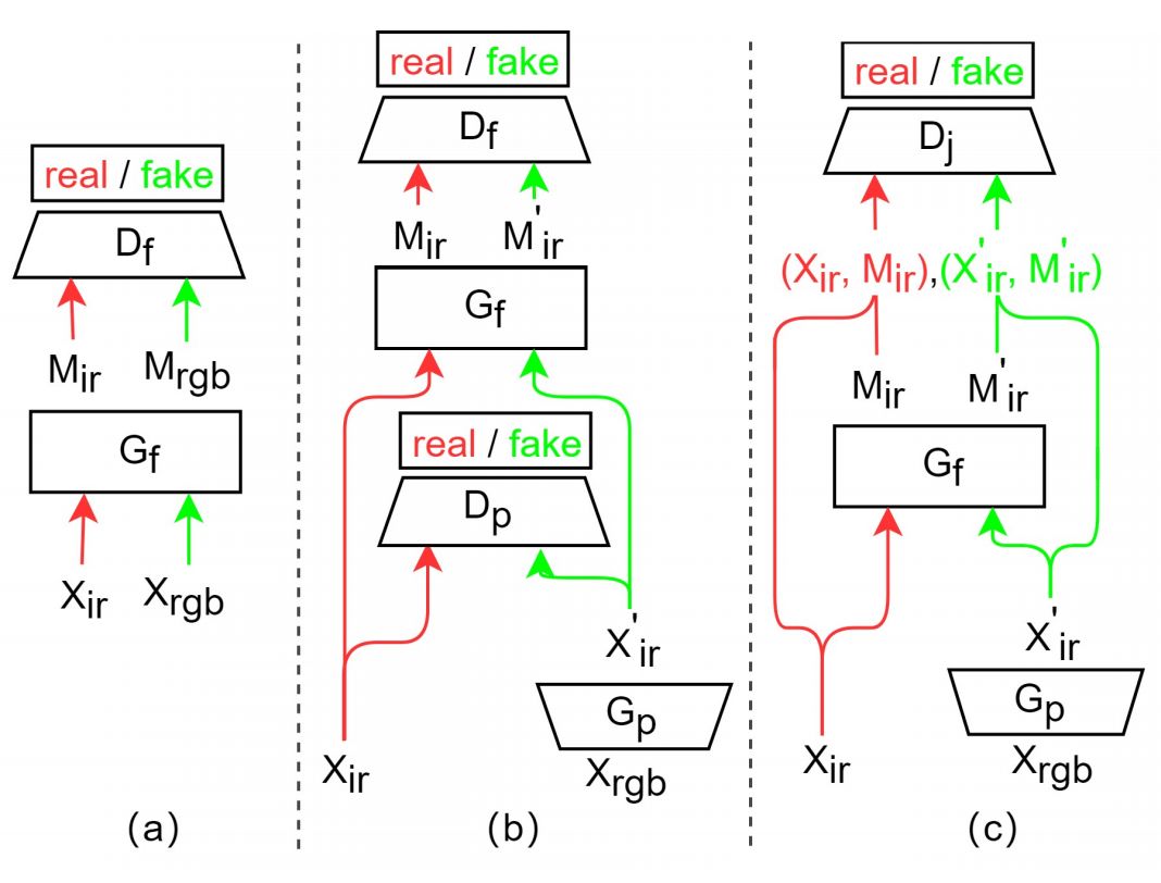 为了解决上述问题,我们进一步提出了一个联合判别模块(Joint Discriminator Module)。如图2所示,联合判别模块并不单独最小化RGB和Infrared图像之间,或者RGB和Infrared特征之间的差异,而是最小化RGB和Infrared图像-特征对之间的差异。即,我们优化RGB图像-特征和Infrared图像-特征的联合分布。