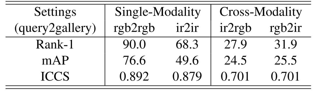 夜间行人重识别未被很好解决。为了能够更好的讲行人重识别算法应用在夜间场景,一些相应的目前的彩色-红外跨模态行人重识别算法(RGB-IR Person Re-Identification)被提了出来,来解决这种不同性质图片之间的模态差异。目前,这些方法的主要策略是特征对齐(feature alignment),即通过一些网络结构、损失函数设计,把两种不同的数据映射到一个特征空间,来减少他们的模态差异(modality gap)。但是从实际效果来看,由于两种数据的差异巨大,单一使用这种方法无法较好的解决夜间行人重识别问题。如下表所示,即便是目前最优异的算法,它的rank-1性能在夜间场景下只能达到27.9%,而在相应的日间场景下,可以轻松到达90%。