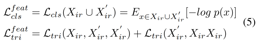 特征对齐模块(Feature Alignment Module)。 尽管特征对齐模块可以减少模态间(inter-modality)差异,但是这里仍然存在着很大的模态内(intra-modality)差异,这些差异主要是由于姿态,视角以及光照等因素造成的。为了解决这个问题,我们采用了一个特征对齐模块,把真实的红外图像和合成的红外图像映射到同一个特征空间,并使用基于身份标签的分类和三元组损失来监督特征。对应的损失函数如公式5所示。