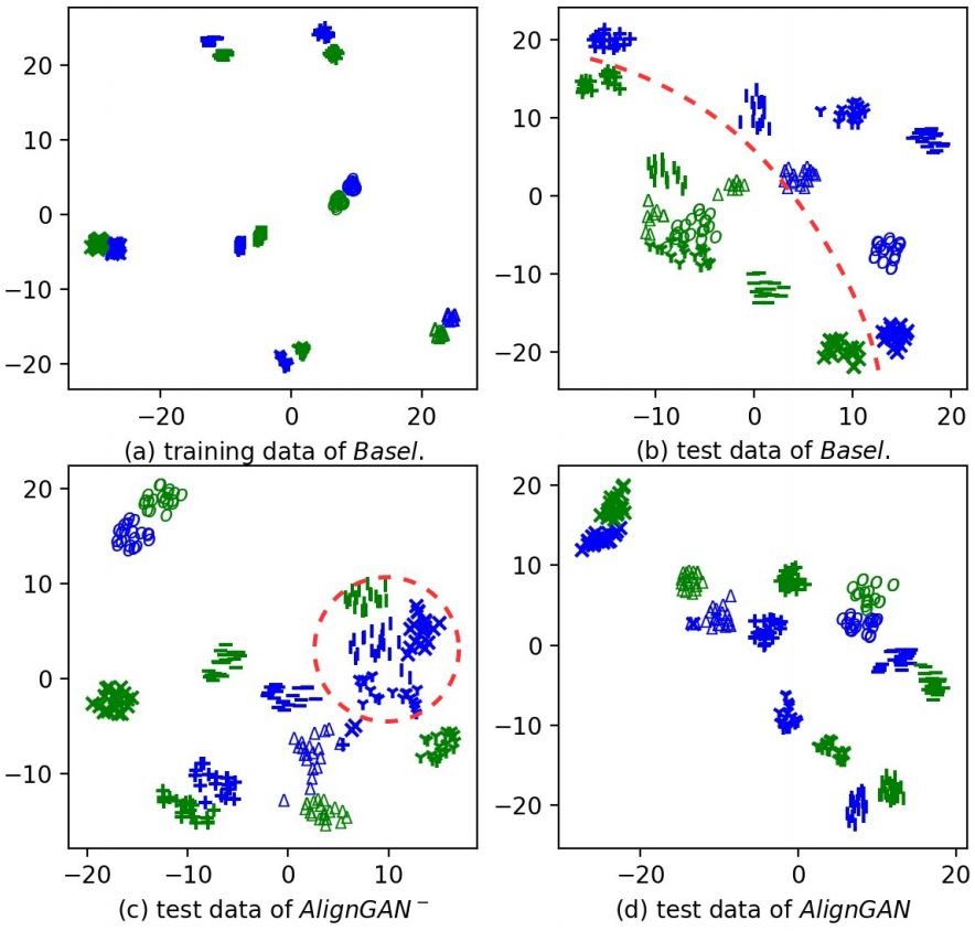 特征空间可视化。如图5(a)和图5(b)所示,一些简单的baseline方法可以很好的对齐训练数据,但是无法很好的对齐测试数据,说明跨模态差异无法通过简单的特征对齐方法进行解决。如 图5(c)所示,当我们只使用像素对齐模块的时候,模态差异已经被极大的减小了,但是仍然存在一些身份不一致的问题(如红圈所示)。最后,图5(d)表明,当使用了我们的联合判别策略之后,身份一致性可以被很好的保持。