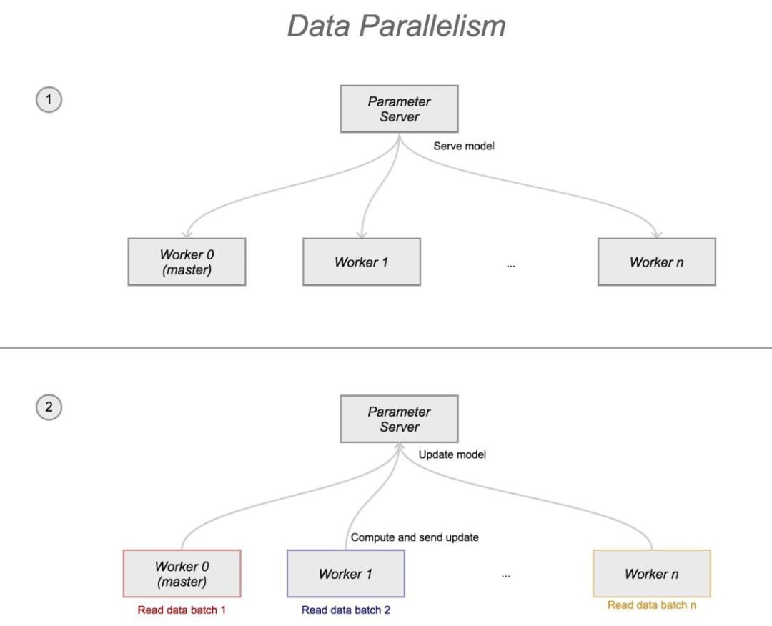 整个计算图被保存在一个或多个参数服务器(ps)中。训练操作在多个机器上被执行,这些机器被称作worker。这些worker读取不同的数据(data batches),计算梯度,并将更新操作发送给参数服务器。