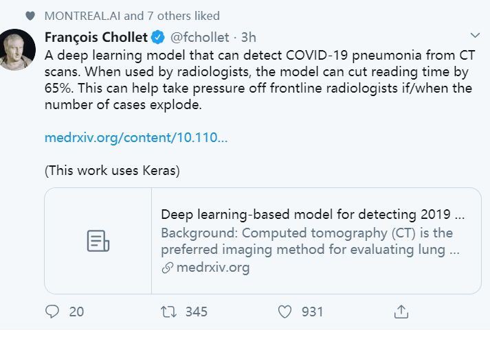 【导读】抗击新冠肺炎疫情还在继续。人工智能深度学习技术在抗击疫情方面有何作用?最近武汉大学人民医院在medRXiv预印版本论文,构建一个基于深度学习的系统,在高分辨率CT上检测2019-nCoV肺炎,减轻放射科医生的工作压力,提高诊断效率。在2月份真实病例数据上的实验结果揭示,基于深度学习的模型在更短的时间内取得了与专家放射科医师相当的效果。它在提高诊断效率、减轻一线放射科医师的工作压力、加快COVID19患者的诊断、隔离和治疗等方面具有巨大的潜力,有助于控制疫情。值得一提的是,该工作也得到了Keras作者 François Chollet的推评,本工作用到了Keras。