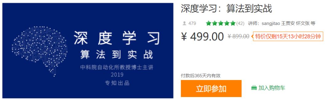 专知2019年《深度学习:算法到实战》精品课程,479位同学在学习,现在报名,限时优惠!网易云课堂人工智能畅销榜首位