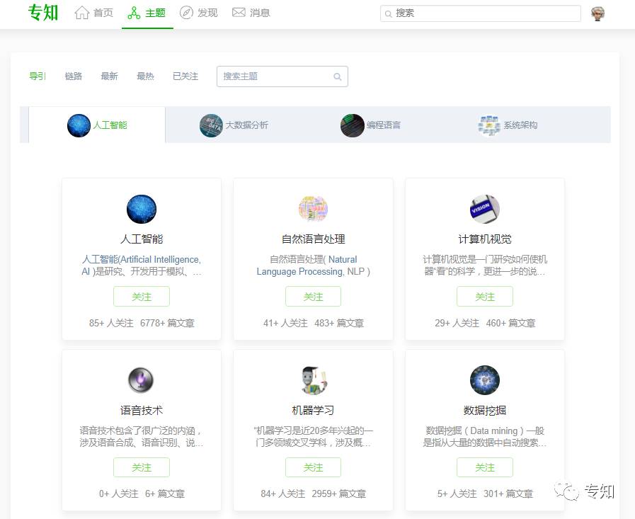 通过主题知识树,你可以循着层次结构进行内容阅读和知识获取。并基于人工智能、大数据、系统架构、编程语言等主类目来一站式的了解学习AI。