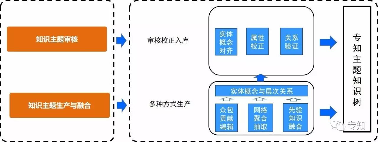 参照知识图谱构建的方法,我们提出一种实用的构建主题知识树的方法,并研发配套的构建支撑系统。构建的方法采用网络采集聚合抽取、众包机制贡献、先验知识融合的三种知识来源方式进行融合构建完成初步主题知识树,最后由专家人工审核构建完成。整体的流程框架图如下: