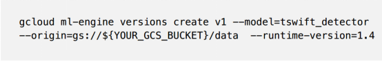 现在您已经准备好将模型部署到机器学习引擎上进行服务。首先,使用gcloud命令创建你的模型: