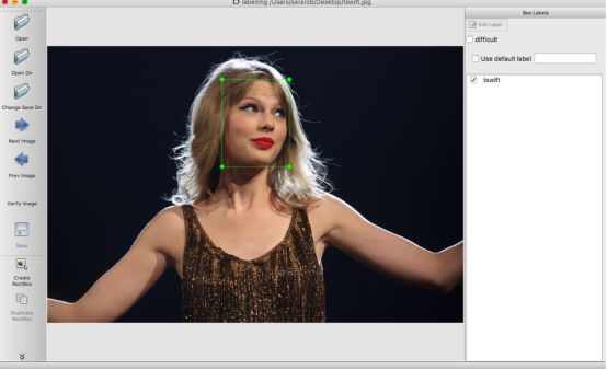 要生成图像的边界框,我使用了LabelImg(https://github.com/tzutalin/labelImg ),LabelImg是一个Python程序,可以让你手动给图像打标签,并返回每个图像的边界框和相关标签的XML文件。下面是它的工作原理,我定义了一个图像的边界框,并打标签tswift: