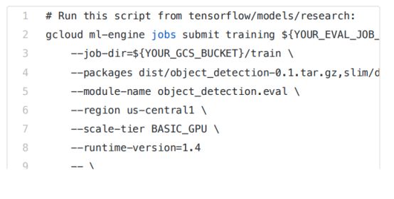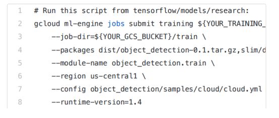 现在已经准备好所有的训练文件,我可以使用gcloud命令来开始训练。 请注意,您需要在本地拷贝一份tensorcow / models / research并在该目录下运行以下的训练脚本: