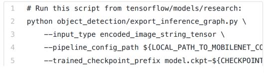 检查点文件的第一行将告诉我最新的检查点路径,我将从该检查点本地下载3个文件。每个检查点应该有一个.index,.meta和.data文件。这些保存在本地目录中,我可以使用目标检测手动脚本export_inference_graph将它们转换为ProtoBuf。要运行下面的脚本,您需要在MobileNet配置文件添加本地路径,你需要从训练任务中下载模型检查点的编号,以及要导出的图形的目录名称: