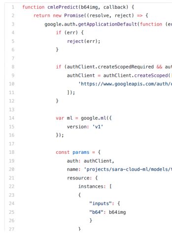 接下来,我编写了上传到我的项目的云存储触发的Firebase数据库。它把图像进行64位编码,并发送到机器学习引擎进行预测。你可以在这里找到完整功能的代码。下面是我向机器学习引擎预测API发出请求的函数部分。