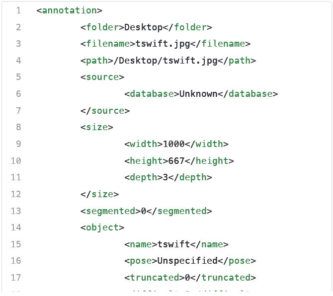由于对象检测API(Object Detection API)会输出对象在图像中的位置,因此不能将图像和标签作为训练数据传递给对象。 需要传递一个边界框(bounding box)来标识图像中的对象以及与边界框的标签(在我们的数据集中,我们只有一个标签,就是tswift)。
