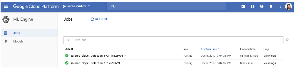 您可以通过云端控制台来浏览机器学习引擎的“作业”部分,这一部分可以验证您的作业是否运行正确,并且可以检查作业的日志。