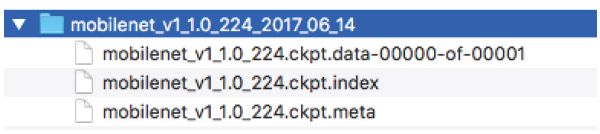 我不是从零开始训练这个模型,所以当我进行训练时,我需要使用预训练模型。 我选择使用MobileNet模型 - MobileNets是一系列针对移动优化的小模型。尽管MobileNet训练很快,并且预测更快, 但是我不会直接在移动设备上使用我的模型。 我下载了MobileNet校验文件进行训练。 校验文件是一个二进制文件,它包含了训练过程中TensorFlow模型在一些特殊点的状态。下载并解压缩校验文件后,您会看到它包含以下三个文件: