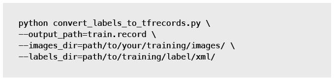 现在我有一个图像,一个边界框和一个标签,但我需要将其转换为TensorFlow接受的格式 – TFRecord(这种数据的一种二进制表示)。我写了一个脚本来实现格式转换。要使用我的脚本,您需要安装tensorflow / models,从tensorflow / models / research目录运行脚本,参数传递如下(运行两次:一次用于训练数据,一次用于测试数据):