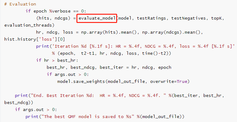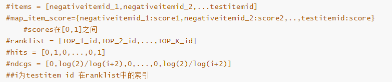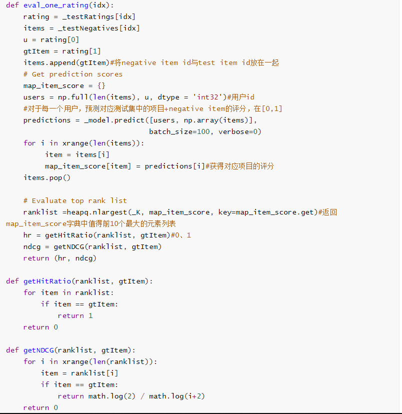 在evaluate_model()函数中主要通过以下三个函数实现,在eval_one_rating中计算得到了测试数据(negativeitem id +testitem id)中Top K的 item id(存放在ranklist中)。通过调用getHitRatio函数得到testitem id是否存在于Top K中(存在的话,hr = 1,否则为0)。