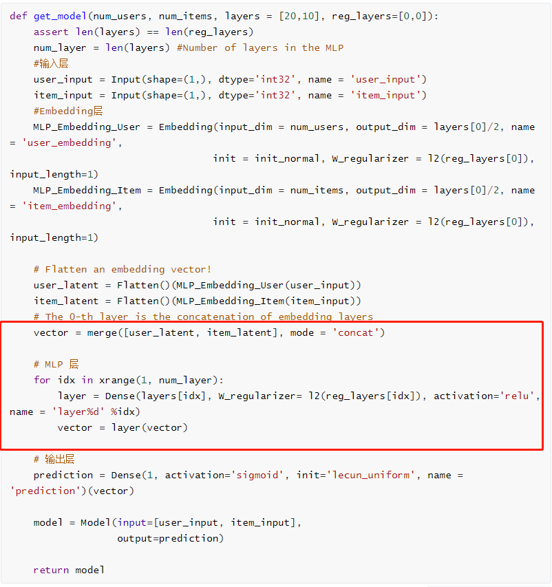与MF不同的是,MLP层的输入是用户潜在向量(p_i)与项目潜在向量(q_i)经 contract拼接的方式连接起来的向量。MLP层是通过for循环构建的。
