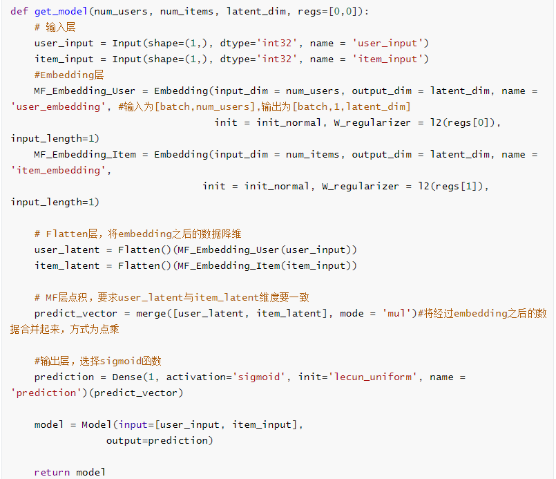在GMF中使用了keras中的Embedding层进行Embedding操作,MF部分直接将经过Flatten层处理后的用户潜在向量(p_u)与项目潜在向量(q_i)经过merge函数用乘积的方式连接。