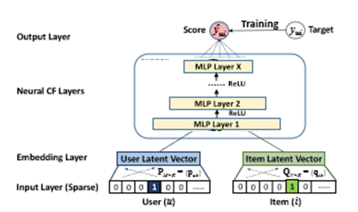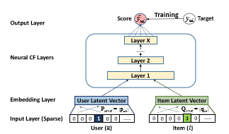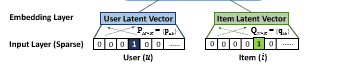 NCF的输入是经过one-hot编码之后的二值化稀疏向量。由于存在数据稀疏的情况,需要经过Embedding将输入层的稀疏表示映射为一个稠密向量(dense vector)。