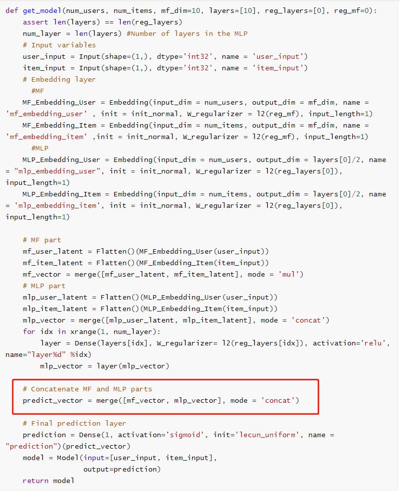 在 NeuMF模型中,前面部分是GMF与MLP的模型,在最后的输出层将两个模型的输出通过merge()拼接起来。