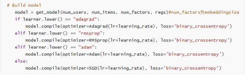 源码中提供了实现了论文中提到的基于NCF框架的三种实例的代码,GMF、MLP只有在构建的模型部分不同,NeuMF除了构建模型不同以外还增加了预训练的部分,用训练好GMF、MLP的参数初始化 NeuMF 相应部分的参数。下面主要介绍这三个模型的构建。