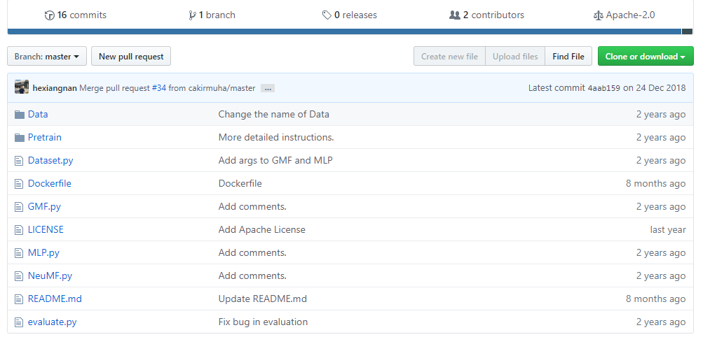 官方给出了经过处理的 MovieLens 1 Million (ml-1m) 和 Pinterest (pinterest-20)两个数据集,源码中使用了MovieLens 1 Million (ml-1m) 数据。