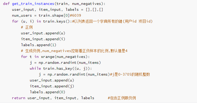 在训练时会在训练数据中加入负例(negative instances),通过get_train_instances()函数获得。