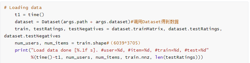 在此部分主要构造了三个数据集,分别为trainMatrix、testRatings、testNegatives。