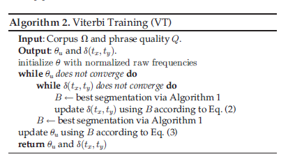 给定θu和δ(tx,t_y),最大化公式(1)来找到最好的分割,论文中采用一种用于POS引导短语分割的搞笑动态编码算法: