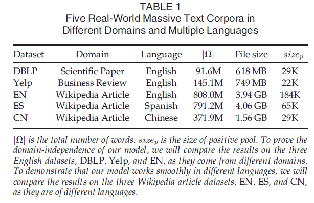 公共知识库(例如维基百科)中获取的高质量短语将其放在正池中;基于n-gram的候选短语熟练非常多,其中大多数质量比较差,因此,从给定语料库派生的候选短语如果不能匹配到公共知识库中的的任何高质量短语,那么就会用于填充嘈杂的负池。