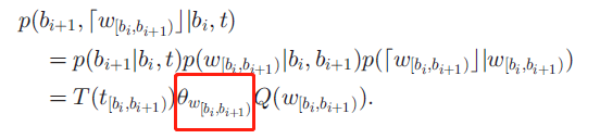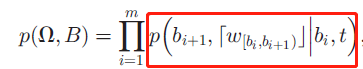 红框中表示的是给定文档短语中的POS词性标签tbr-1精确位于POS词性标签tbr之前的概率。上述这个公式,第一个乘数表示的是在词索引r-1与r之间的短语边界,然而后边的乘数表示的是在t中的所有POS词性标签在同样的短语的概率。