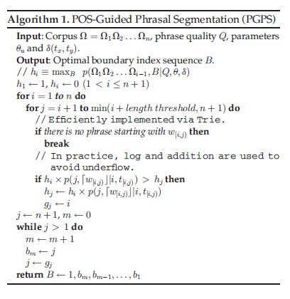 红框中指的是这些单词构成的短语,Q表示的短语质量评估,最初是通过数据中的统计特征学习的,目的是为了对一致性和信息性进行建模。要注意的是短语质量评估是独立于POS标签的,对于unigrams,只需将其词组质量设置为1。