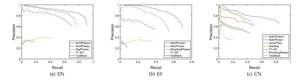 AutoPhrase可以额外获取单个词,召回率可以提高10%至30%,用3个不同的数据集:EN, ES和CN来进行评估。