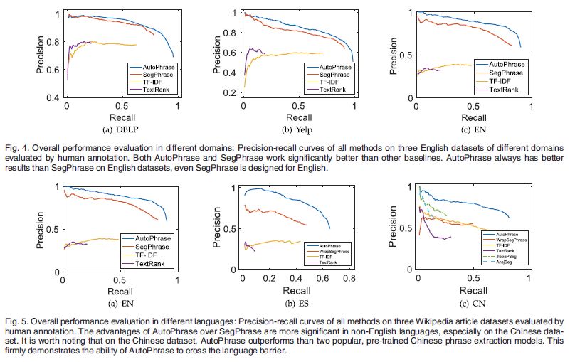 上图中明显看出AutoPhrase效果最好,并能够以最少的人力来支持不同领域并支持多种语言。